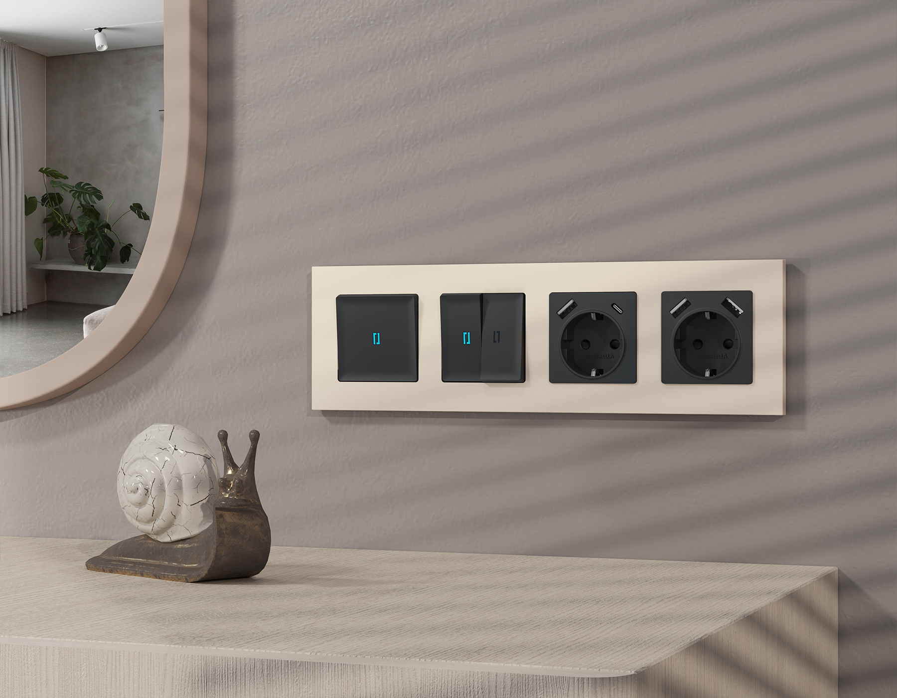 Многогранный ассортимент Ambrella Volt включает в себя механизмы, лицевые панели и рамки, а также комплекты, доступные в различных цветовых решениях. Продукция представлена в модульном исполнении, что позволяет гибко настраивать внешний вид и функциональность. Вам будет легко заменить лицевую панель, рамку или механизм, найдя идеальное сочетание цветов.